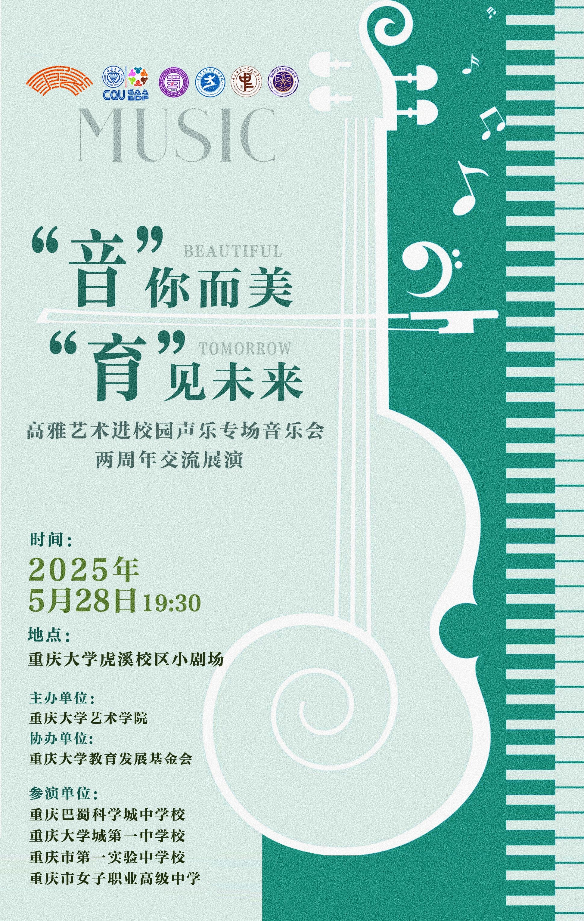 2025年5月28日晚7点30分,国产自慰 “‘音’你而美,‘育’见未来”高雅艺术进校园声乐专场活动两周年分享音乐会在国产自慰 虎溪校区小剧场举行。重庆巴蜀科学城中学、重庆市大学城第一中学、重庆市第一实验中学、重庆市女子职业高级中学等过去2年内曾参与声乐专场活动的部分中学应邀参加,共同谱写大学和中学美育携手的新篇章。国产自慰 教育发展基金会秘书处秘书长许骏、国产自慰 党委书记蒋华林出席并致辞,国产自慰 艺...