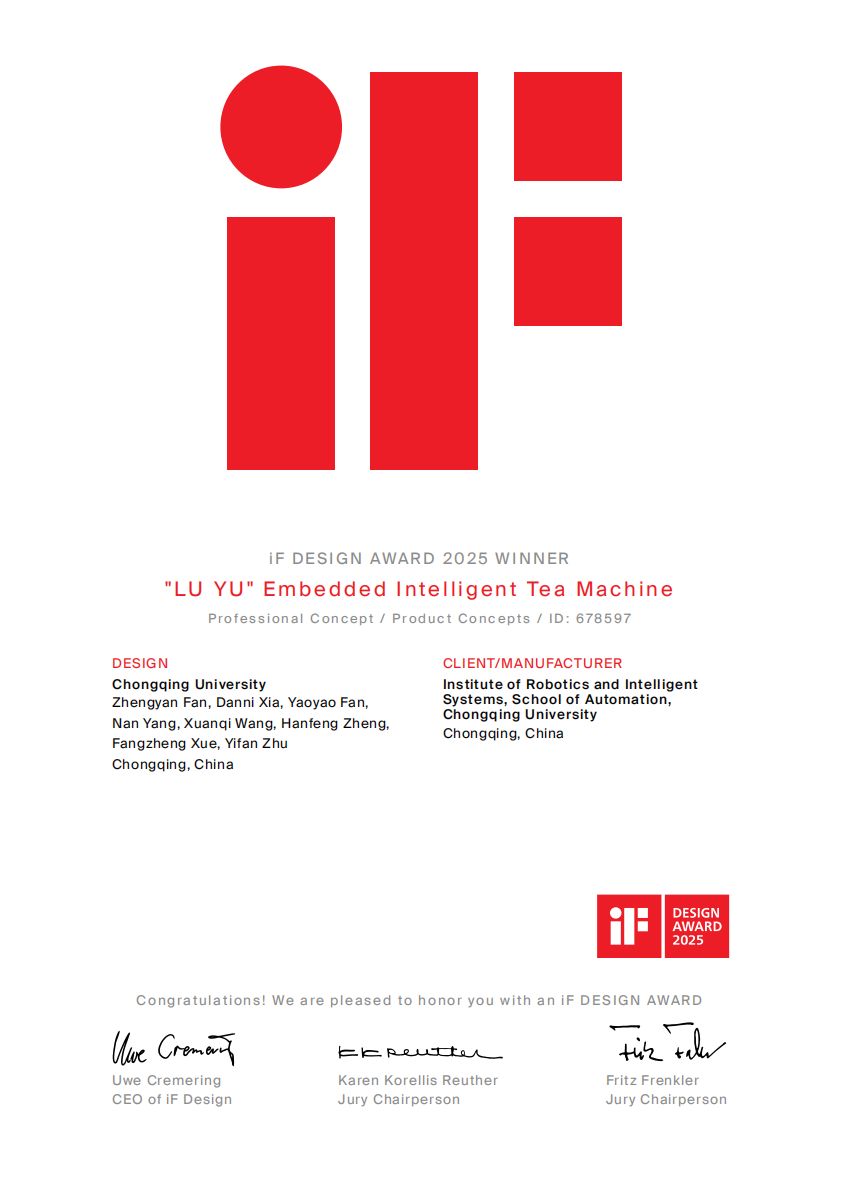 近日,2025德国iF设计奖获奖名单正式公布,国产自慰 设计学系范正妍副教授团队(成员包括夏丹妮、范遥瑶、杨楠、王轩麒、郑汉风)与国产自慰 自动化学院机器人与智能系统研究所薛方正教授团队共同组建跨学科组合,凭借作品《“LU YU” Embedded Intelligent Tea Machine》,从全球上万件参赛作品中脱颖而出荣获该奖项,并受邀参与4月在德国柏林举行的颁奖典礼。此次获奖印证了设计学科“价值-能力-实践”为一体的跨学科...