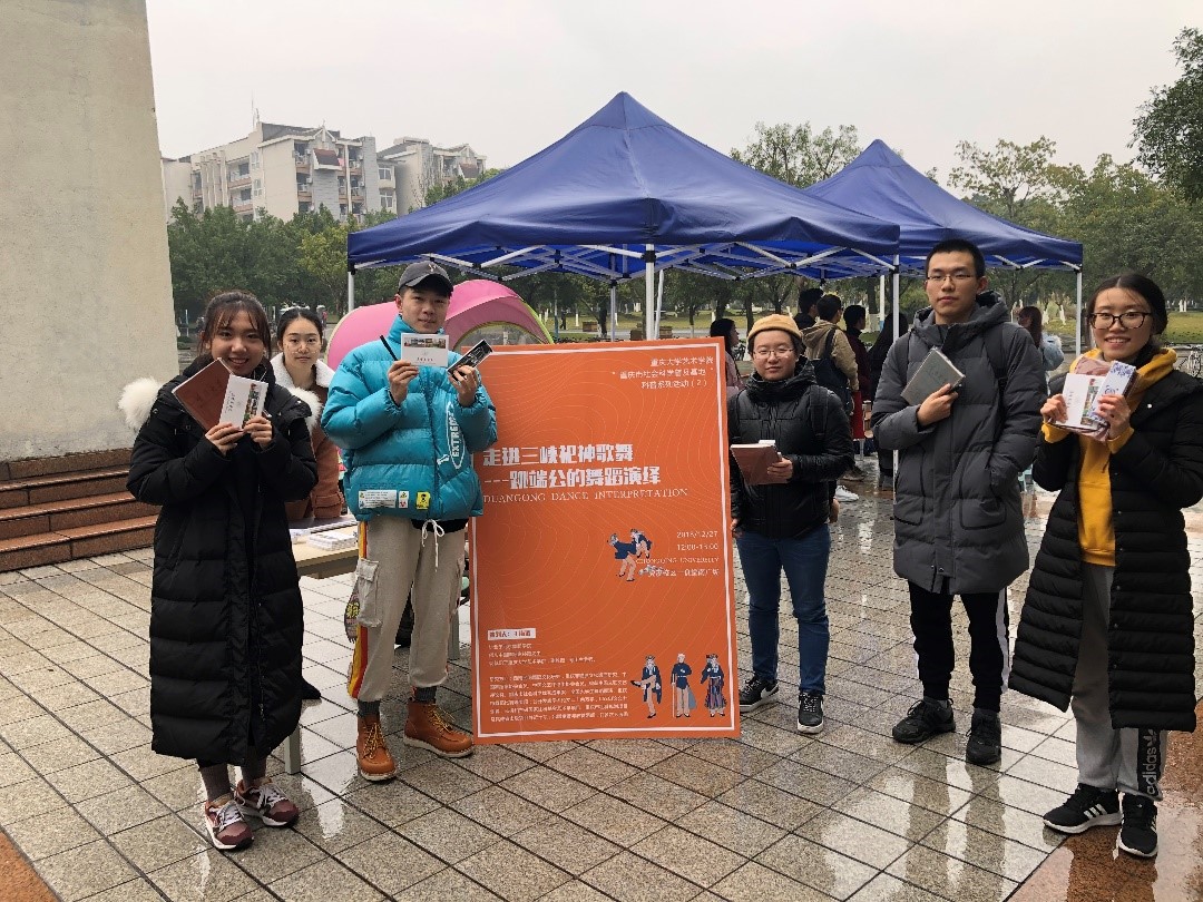 2019年12月20日中午,国产自慰 王海涛副教授作为此次活动的负责人,带领舞蹈学研究生团队,在国产自慰 虎溪校区一食堂南广场举办了“重庆市社会科学普及基地“2019年科普系列活动之一《美美与共——舞蹈美育培养与传播》科普活动。本次活动主题鲜明,形式多样,趣味十足,引来大批学生驻足,并积极参与活动。现场气氛活跃,科普活动圆满成功。活动开始前,舞蹈学研究生们在活动地点布置场地,准备精美的奖品,播放宣传ppt,营造...