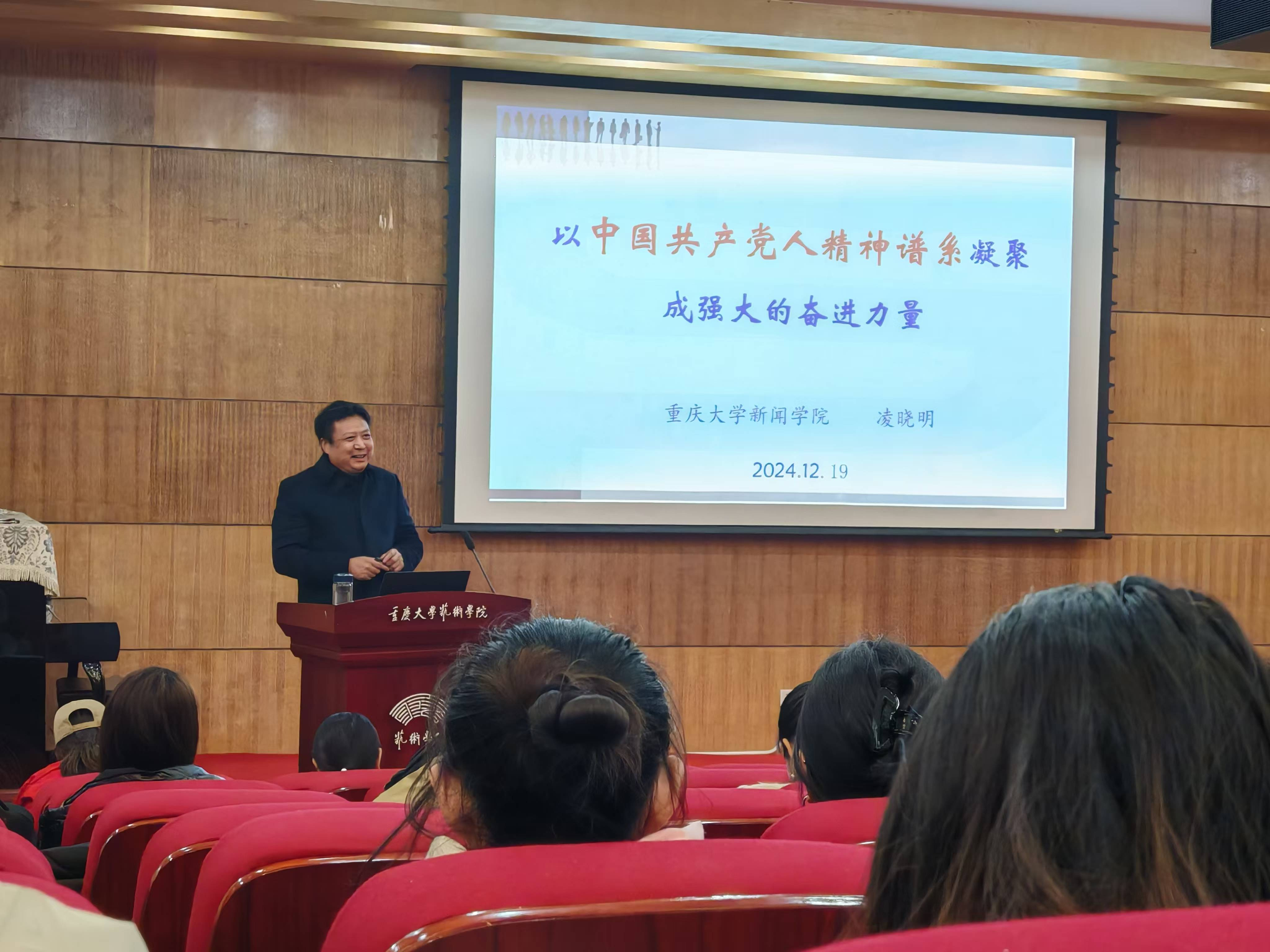 2024年12月19日下午,根据学校有关工作安排,国产自慰 党委在学院报告厅举行“共产党人精神谱系宣讲会”,国产自慰 “中国共产党人精神谱系”宣讲队成员、国产自慰 新闻学院党委书记凌晓明同志应邀作宣讲。学院党委书记蒋华林、院长张楠木,党委副书记王琦,副院长夏进军、彭小希出席会议,学院党员和教职工参加会议。蒋华林主持宣讲会。凌晓明作了题为《以共产党人精神谱系凝聚成强大的奋进力量》宣讲报告。报告在把握“...