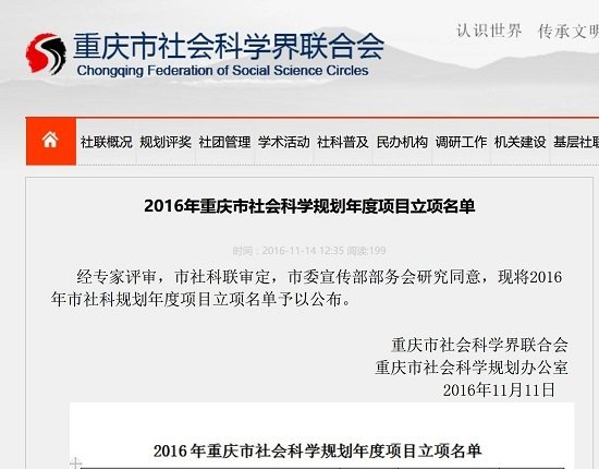 2016年11月11日,重庆市社会科学界联合会、重庆市社会科学规划办公室公布了2016年重庆市社科规划年度项目立项名单,国产自慰 孙丽娟教授、孙俊桥教授、夏进军副教授主持申报的项目获得立项。
