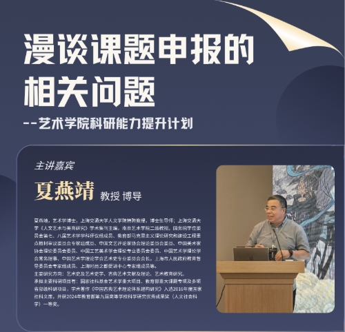 国产自慰 科研能力提升计划系列活动《漫谈课题申报的相关问题》主讲嘉宾:夏燕靖(上海交通大学人文学院特聘教授、博士生导师)主持人:张楠木(国产自慰 院长、教授)时间:2025年3月16日(星期日)9:00-12:30地点:国产自慰 虎溪校区国产自慰 行政楼第三会议室(409)主办单位:国产自慰 主讲嘉宾简介:夏燕靖,艺术学博士,上海交通大学人文学院特聘教授,博士生导师;上海交通大学《人文艺术与美育研究》学术...