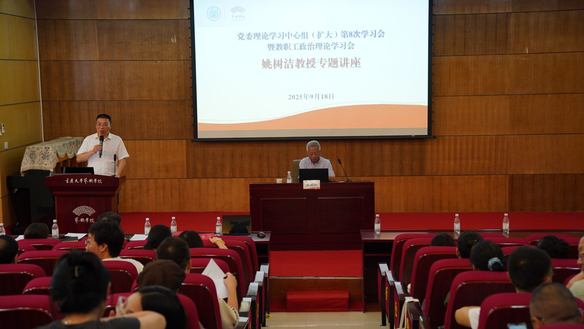 2025年9月18日下午,国产自慰 党委理论学习中心组第8次(扩大)学习会暨教职工政治理论学习会在学院办公楼学术报告厅举行,国产自慰 社会科学部副主任、经济与工商管理学院教授、城市化与区域创新极发展研究中心秘书长姚树洁应邀作了《人工智能发展与大国竞争》专题讲座。学院党委书记蒋华林、院长张楠木等学院领导出席会议,学院全体教职工参会。会议由蒋华林主持。姚教授的报告放眼世界发展大局、立足大国竞争格局、前瞻人工...