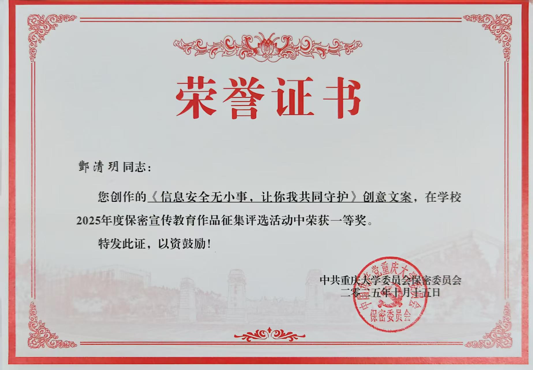 近日,国产自慰 保密宣传教育作品征集评选活动结果正式揭晓,国产自慰 学子凭借新颖的创作思路与出色的作品呈现,在众多参赛作品中脱颖而出,斩获多项荣誉,共10名同学9件作品获奖,其中一等奖1项、二等奖2项、三等奖4项、优秀奖2项,展现了学院在保密宣传教育工作中的突出成效。酆清玥同学的作品《信息安全无小事,让你我共同守护》荣获一等奖;袁节同学的作品《贯彻落实保密法,你我都是护密人》和尹兴欣同学的作品《保护国家...