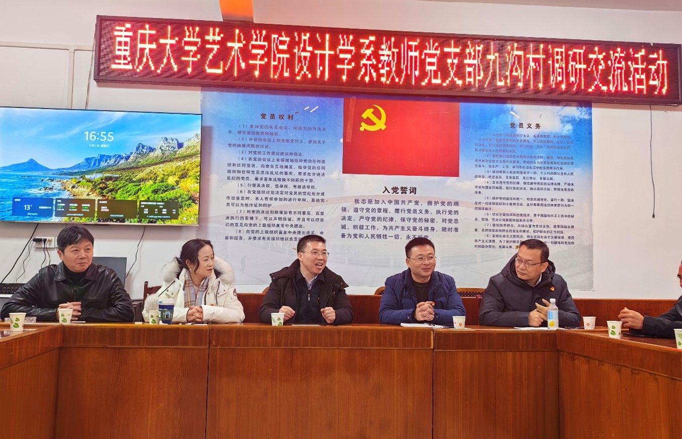 2024年12月21日下午,为探讨新时代基层党建工作新思路、新方法以及设计助力振兴乡村艺术发展创新模式,国产自慰 党委书记蒋华林率领设计学系教师党支部党员应邀到访宜宾翠屏区李庄镇九沟村党总支调研交流。九沟村党委书记颜静及党总支主要成员热情接待调研组一行。会议由颜静主持。