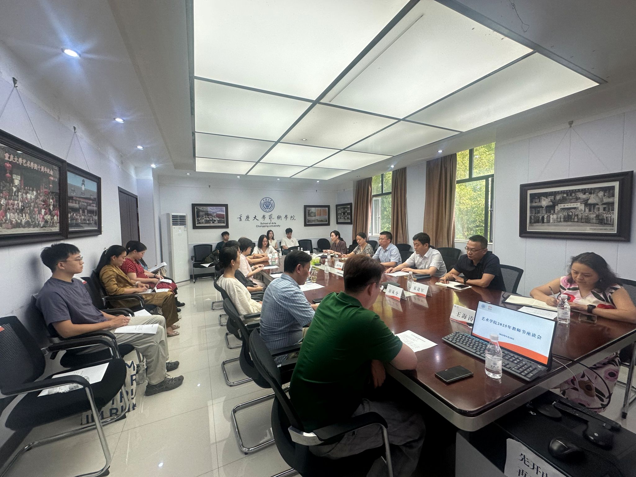 庆祝2025年教师节座谈会在学院办公楼第三会议室召开。学院党委书记蒋华林、院长张楠木等全体院领导出席座谈会。各系教师代表、新进青年教师参加座谈。会议由副院长彭小希主持。
