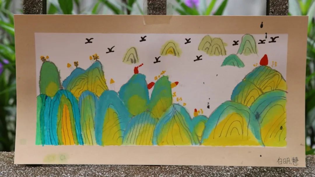 活动现场,一幅幅多彩画作整齐有序的排列在古亭长廊两侧,有师生共绘长卷、国画花鸟、特色版画、民族纹饰、我的家乡风景等作品,并按照作品元素分别设置了国画体验区、版画区、民族元素区、创意区等不同区域进行展示,方便群众参观。此次参展作品形式多样、创意满满,引得参观群众连连称赞,在每一幅画作上也或多或少“结满”了小印章,现场一片热闹。