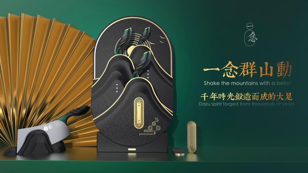 研究生杨宇辰、董杰团队形成了以群山造型元素为基础的《一念群山动》伴手礼品刀具套装,一方面改变了传统厨用刀具的外形,将飞水流云纹元素巧妙地融入刀具中,刀具盒采用岩板的材质,充分考虑到产品的材料性能和成本可控问题。