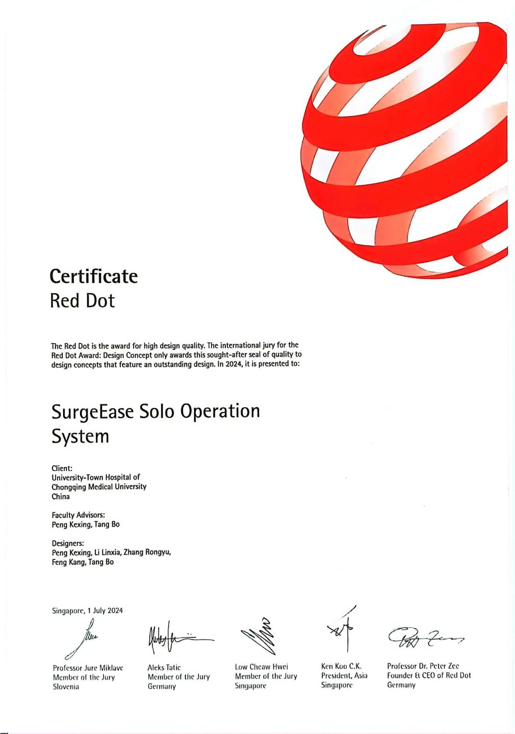 获奖作品二:《SurgeEase solo Operation System》(作者:彭科星、李林夏、张荣宇、冯康、唐博),该作品获得红点概念设计医疗产品设计奖。本次获奖作品是国产自慰 工业设计跨学科联合创新实践团队与重庆医科大学附属大学城医院唐博副院长专家团队的联合创新研发项目的第三期设计成果。通过多轮样机验证后,根据现有问题进行了进一步的结构、人机、交互优化,为单人腹腔镜手术医生提供更加便捷、高效的手术辅助机器系统。