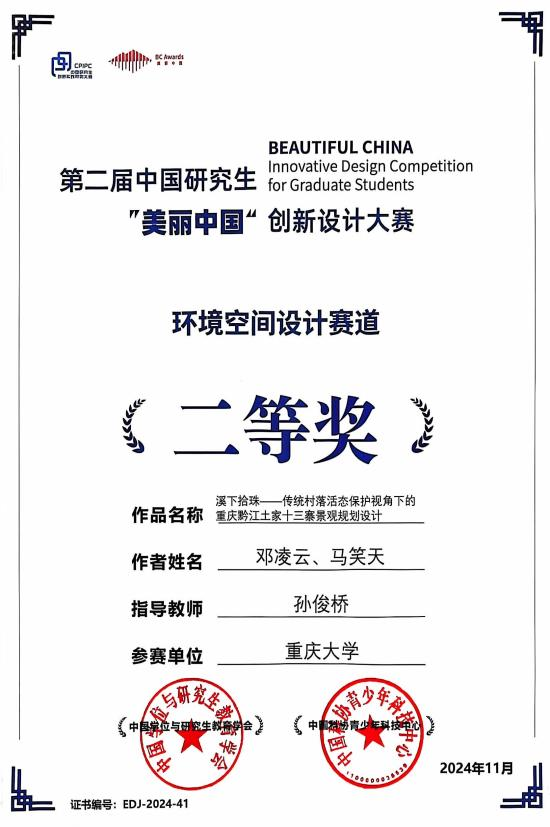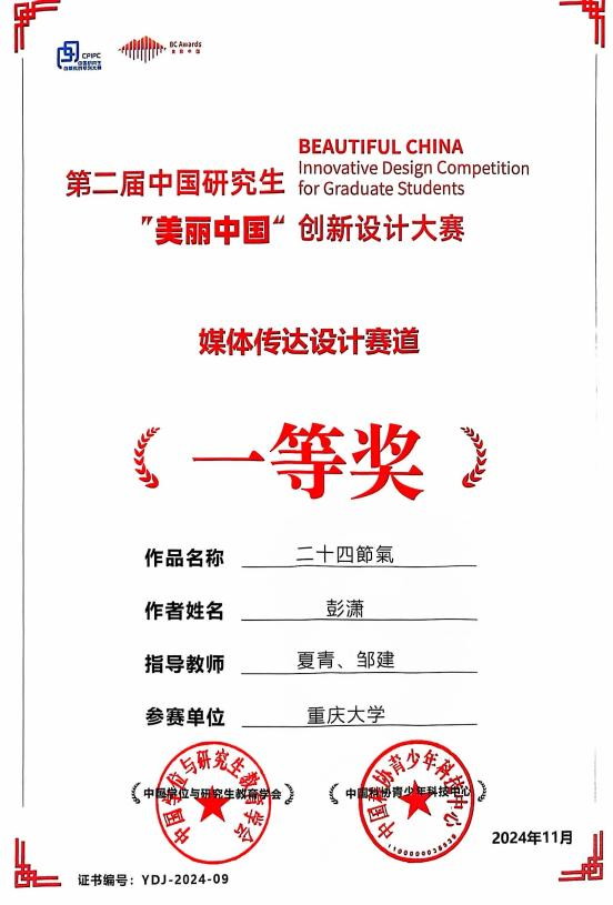 2024年11月,第二届中国研究生“美丽中国”创新设计大赛圆满落幕,国产自慰 设计学系研究生在本次大赛中取得了优异成绩。在“媒体传达设计”赛道中,彭潇作品《二十四節氣》获得一等奖(指导教师:夏青、邹建);在“环境空间设计”赛道中,邓凌云、马笑天合作作品《溪下拾珠——传统村落活态保护视角下的重庆黔江土家十三寨景观规划设计》获得二等奖(指导老师:孙俊桥)。