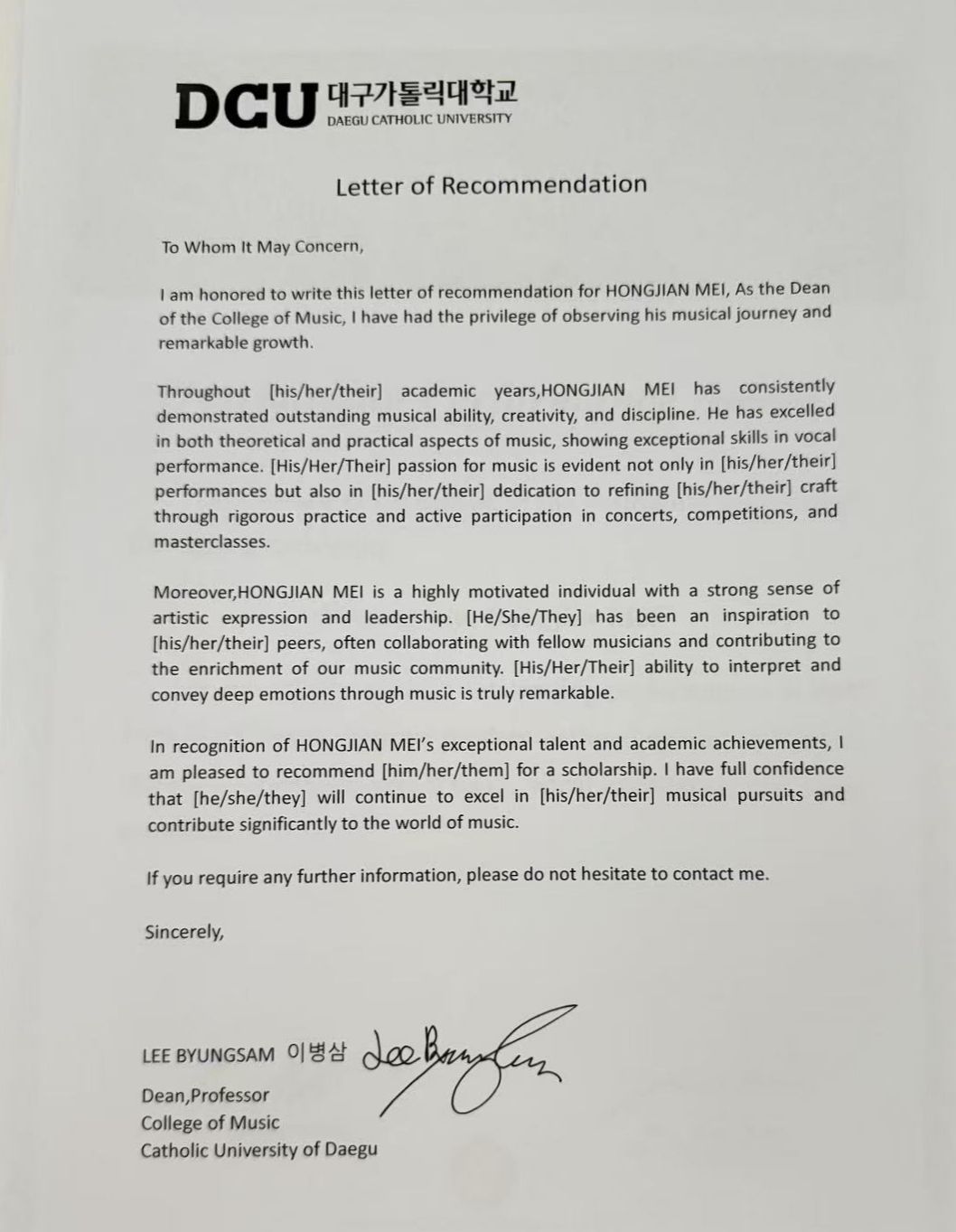 在本次比赛中,音乐系副主任喻思言副教授与黄慧老师,带领学生高晨曦、尹艺萌、梅洪健、谭智荣、鲁敬贤参与美声大学组的角逐。比赛期间,梅洪健凭借扎实深厚的专业功底和极具感染力的舞台表现力,充分展现出国产自慰 音乐系学子的风采。其在赛事中的优异表现也获得了评委们的高度认可,韩国大邱加图立大学音乐学院院长李炳杉教授亲自授予梅洪健该校研究生offer。