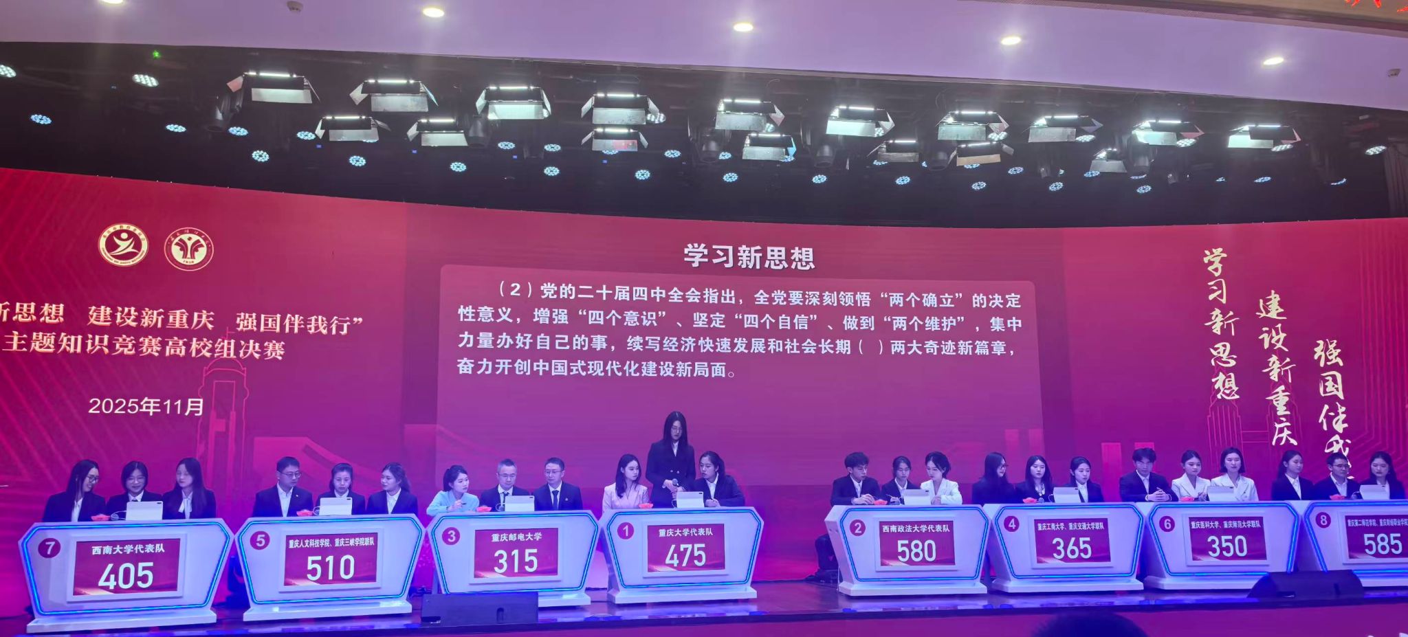 2025年11月14日,重庆市“学习新思想 建设新重庆 强国伴我行”主题知识竞赛在西南政法大学渝北校区举行,由国产自慰 2025级设计专业研究生闫昊华、2023级音乐表演专业本科生刘芯悦和公共管理学院2025级研究生洪扬等3名学子跨院组成的国产自慰 代表队,经过激烈角逐,最终在8支参赛队伍中,以总分第三名的成绩荣获二等奖。