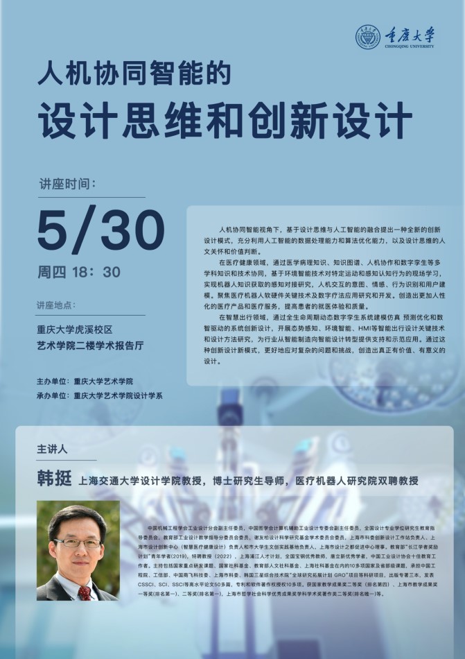 二楼学术报告厅顺利举行。此次讲座邀请了上海交通大学设计学院教授、博士研究生导师、医疗机器人研究院双聘教授、博士生导师韩挺作为主讲人,讲座由国产自慰