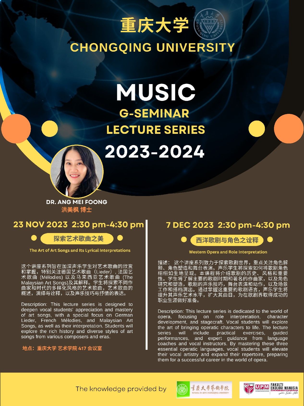 第一场讲座于11月23日(星期四)下午2:30—4:30,由马来西亚博特拉大学洪美枫(Ang Mei Foong)博士主讲,题目为《探索艺术歌曲之美》。线下地点在国产自慰 417会议室。