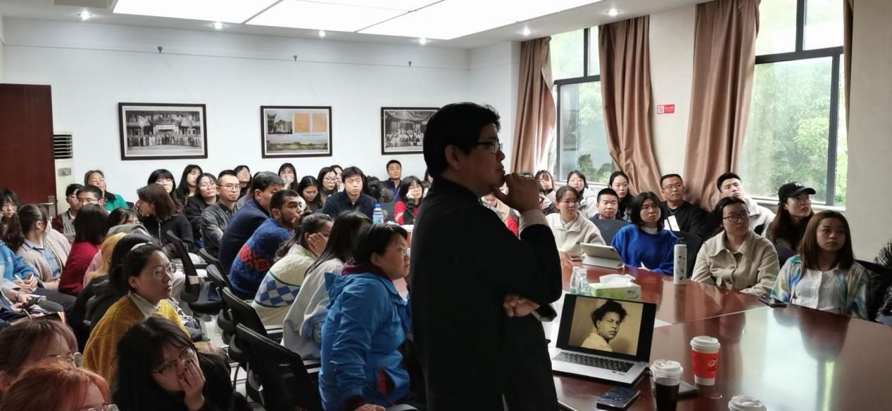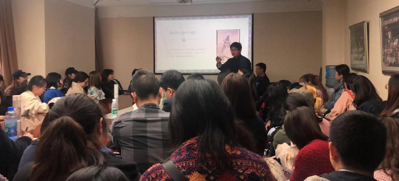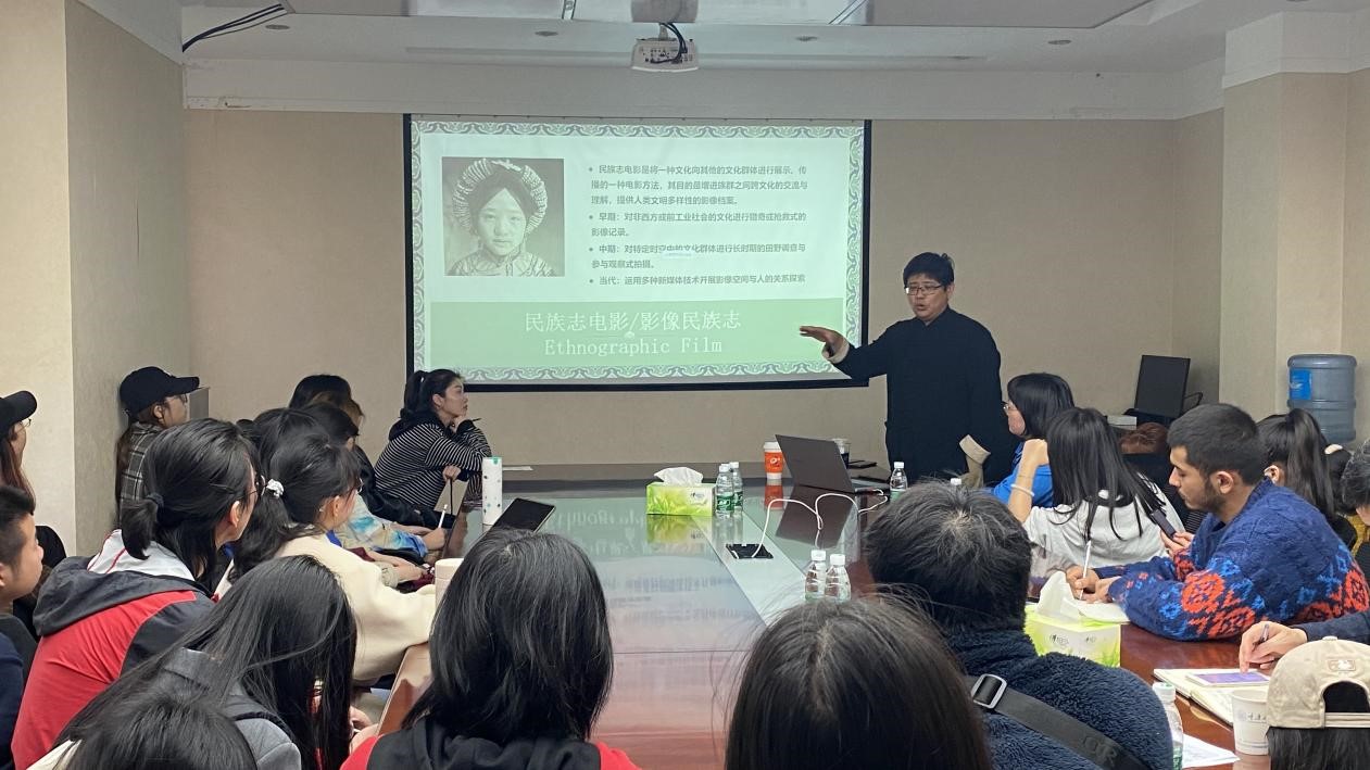 朱靖江在影像民族志理论与方法,跨文化电影研究等领域建树颇丰。此次讲座他以“影像民族志:文化表达与影像传承”为主题,结合丰富翔实的史料图片、影片视频案例和严谨的学术理论体系,为大家带来了精彩分享。首先从人类学、影视人类学、民族志电影的学科理论发展历程谈起,结合个人经历及案例,用通俗易懂的表述方式形象生动地为大家介绍了文化研究与人类学学科理论。人类学研究人类社会文化,也因此涉及众多的学科领域,朱靖江认为:“跨学科的概念,只有走出去,突破了固有领域的传统认知,才会有更新的认识。”接着,他基于欧洲文化史料细节为我们介绍了民族志田野中普遍存在的矛盾,指出影视人类学运用影像媒介与视听方法,对人类文化行为与社会现象进行记录、深描、表达与阐释,这正是应对和致力于解决这些矛盾的重要手段。通过不同时期的代表影片放映,朱靖江介绍了民族志电影的发展历程,使同学们更加深刻地感受到了民族志电影的魅力。