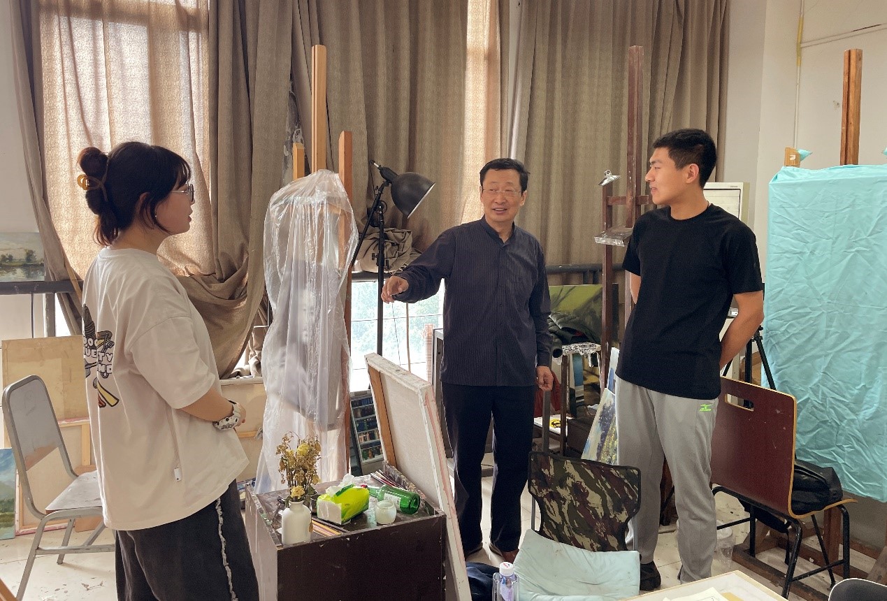 从周一至周四,晓青分别对油画专业本科四个年级的学习情况进行调研,深入课堂,广泛与学生交流,对学生出现的专业问题进行针对性指导。对大四学生的毕业创作逐一讲解指导,提出了具体的修改意见和解决方法,并着重强调要加快创作进度,指出具象写实类的创作,在一定程度上往往是以画面工作量的大小来衡量作品的质量。