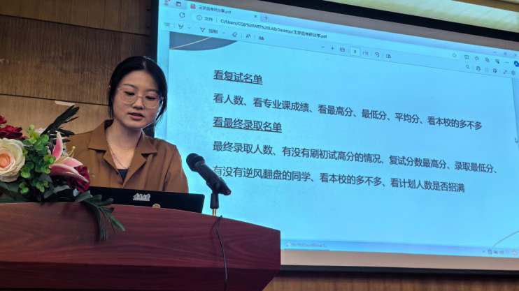2020级中国画班戴语萱、王涵、王梦垚、危逸几位同学在分享会上详细介绍了择校策略、跨考经验、学习方法、备考心态等方面的内容。这些成功的案例和心得,对于美术学系准备考研的学生来说是非常宝贵的经验。多种不同的学习策略,多元化的学习方法,有助于同学们更快找到最适合自己的学习路径,提高学习效率,保持积极的学习态度,同时还能提供心理支持和学习动力。