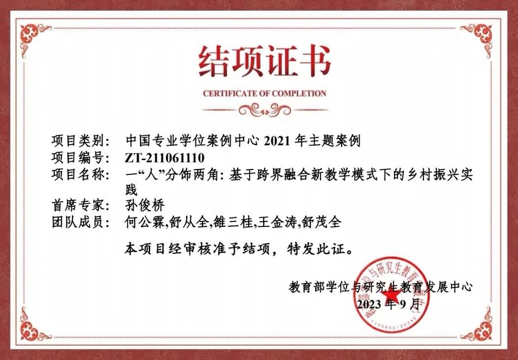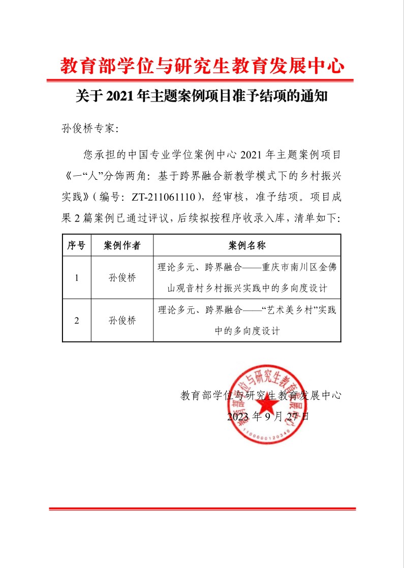 设计学系教授孙俊桥作为首席专家主持的教育部“中国专业学位案例中心2021年主题案例”——《一“人”分饰两角:基于跨界融合新教学模式下的乡村振兴实践》(编号:ZT-211061110)中的两项案例成果:《理论多元、跨界融合——重庆市南川区金佛山观音村乡村振兴实践中的多向度设计》、《理论多元、跨界融合——“艺术美乡村”实践中多向度设计》通过教育部学位中心组织的专家审核,被收录入库并顺利结项。