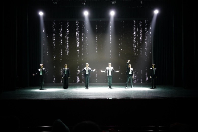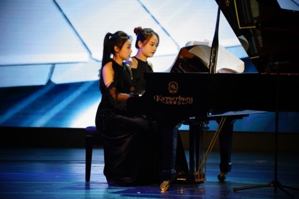 演出由全班合唱《我喜欢》拉开帷幕,这首歌是他们大一进校第一次上台演出的作品,毕业的时候再一次唱响,同学们心中有完全不同的感受。紧接着是男生们帅气的《最佳演出》,六位男同学帅气的演唱掀起了现场的火热气氛。四手联弹的两位同学是以声乐学生的身份入校,钢琴也弹得非常好,她们的表演真切、灵动,充满少女的灵动与活力。