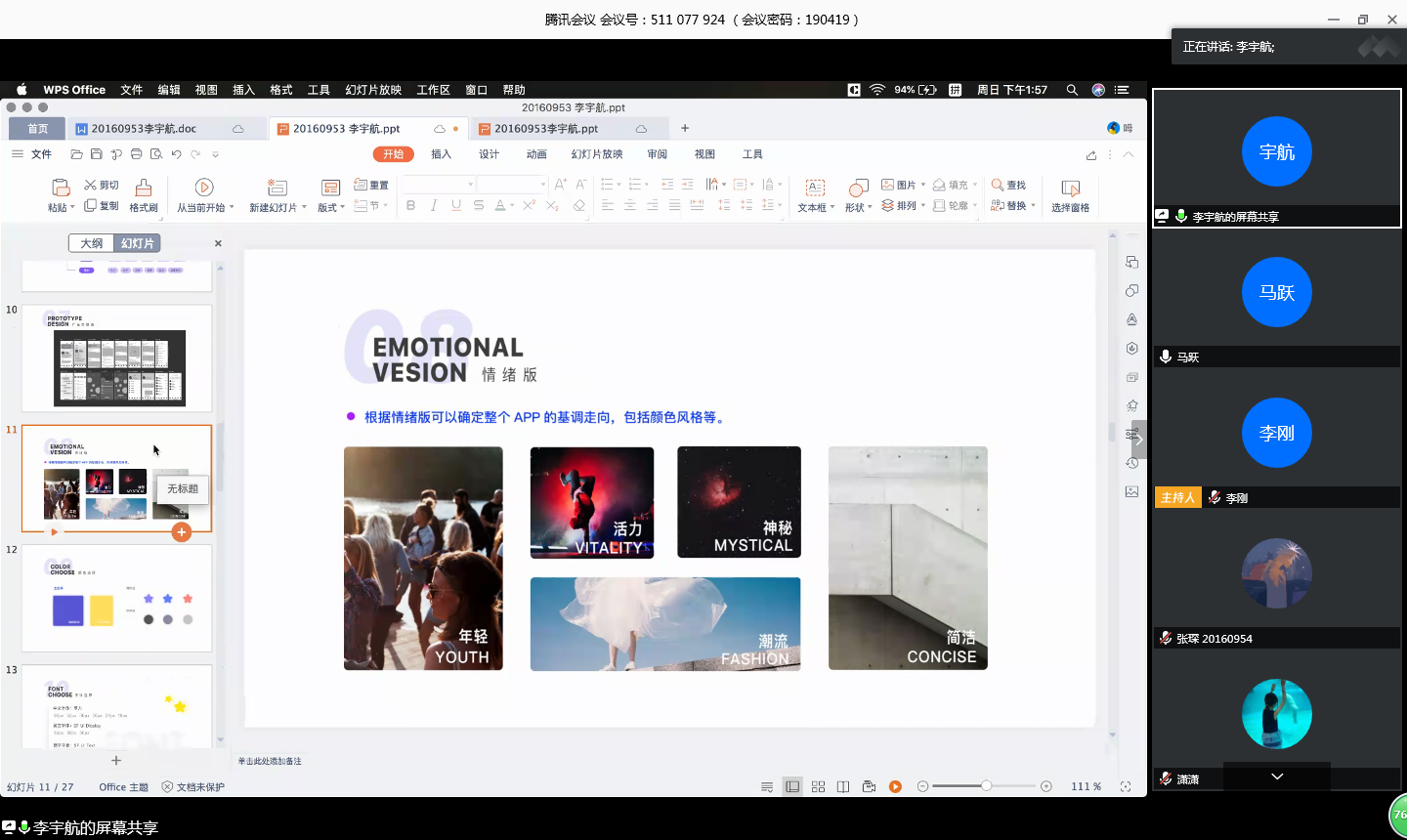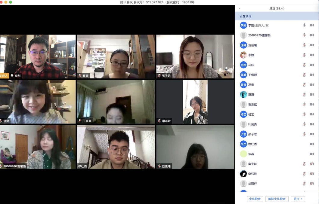 预答辩前一天,参与预答辩的26位同学提前把所完成的答辩资料汇总后通过邮件提交给老师们,方便答辩过程中老师们能够在本地查阅观看。4月19日上午9:15,参与预答辩的老师、同学们陆续进入腾讯线上会议室,大家纷纷打开摄像头、麦克风打招呼。所有人测试完成后,9:30同学们按预先抽签顺序通过共享屏幕结合自己的PPT展示开始正式答辩。在答辩过程中个别同学出现掉线、屏幕共享失败的问题,但在老师、同学们的帮助下都得到了解决,答辩过程进展顺利。