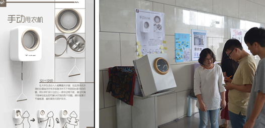 设计心理学是以心理学的理论和方法手段去研究决定设计结果的“人”的因素,从而引导设计成为科学化、有效化的新兴设计理论学科。此次课程设计主要以“大学生寝室生活”为主题,从多角度进行用户心理调查研究,寻求切入点对大学生寝室相关产品进行改良。此次课程设计选题紧密联系大学生生活行为习惯,内容涵盖了包括学生寝室改良式衣柜、寝室收纳神器组合、学生手动甩干机等多项课题。同学们在为期6周的课程期间,通过设计调研、需求分析、功能设计、原理推敲、外观造型、模型制作几个步骤完成了此次设计课题。