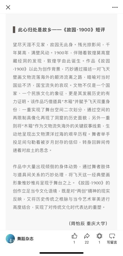 与此同时,由中国舞蹈家协会主办,中国舞蹈家协会理论评论委员会、《舞蹈》杂志社承办的第十四届中国舞蹈“荷花奖”古典舞评奖优秀网络评论征集活动伴随赛事展开。周怡辰同学撰写的两篇短评脱颖而出,连续入选并刊登于“舞蹈杂志”微信公众号。第一篇分析了作品《春江曲》中蕴含的深邃情感,并探讨舞蹈之美如何激活中华优秀传统文化的当代生命力;第二篇则从作品《故园·1900》中提炼出对家国情怀的深刻反思,提出对于传统文化资源在新时代背景下的价值重塑。