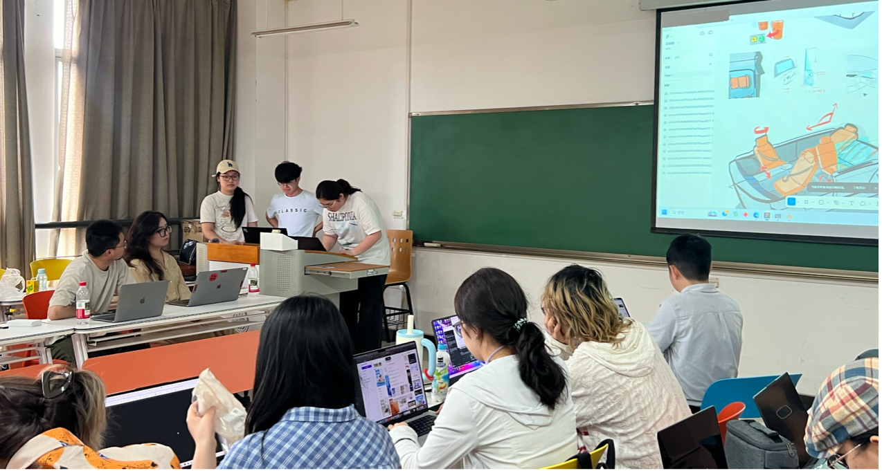 本次课程的亮点之一是学生设计成果的现场分享与双导师点评环节。参与联合课程的学生以小组形式,围绕上汽品牌未来车型设计方向,从外观造型、内饰布局、用户体验等多个维度展示了创意方案。作品既融合了年轻一代对智能出行的想象,也体现了对市场差异化需求的深入思考。