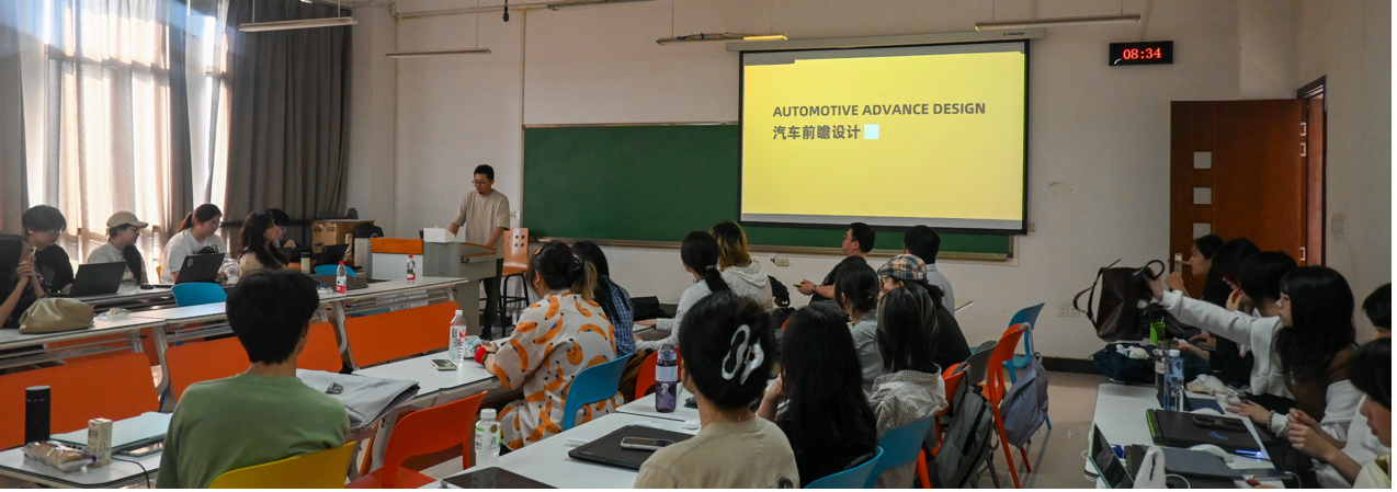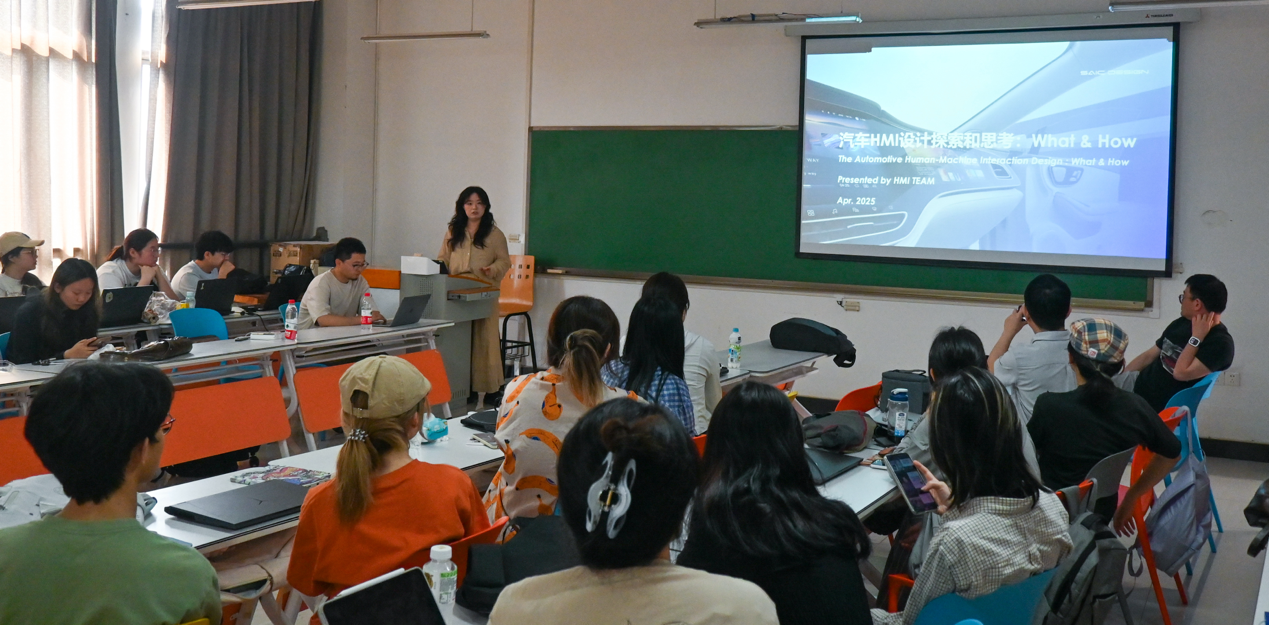 联合课程中,上汽前瞻设计师张宇以“产品策略与前瞻设计”为主题,结合MPV车型开发实际案例,系统讲解了从市场调研、用户需求分析到产品定义的完整流程。他强调,前瞻设计需以技术趋势和未来场景为导向,并现场剖析了前瞻设计师的核心能力——包括洞察力、跨学科整合能力以及对商业逻辑的精准把控。张宇的分享为学生们打开了从概念到落地的设计思维路径。随后,上汽HMI设计师查睿窈以“汽车HMI设计的探索与思考”为题,通过上汽MG Cyberster智能座舱的HMI设计案例,拆解了人机交互界面设计的核心逻辑。她以“WHAT & HOW”为框架,从用户场景模拟、交互体验优化到视觉语言构建,生动展示了智能座舱设计的创新方法论,并鼓励学生“以用户为中心,用设计驱动技术的人性化表达”。