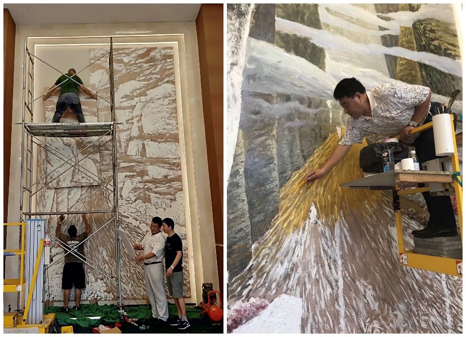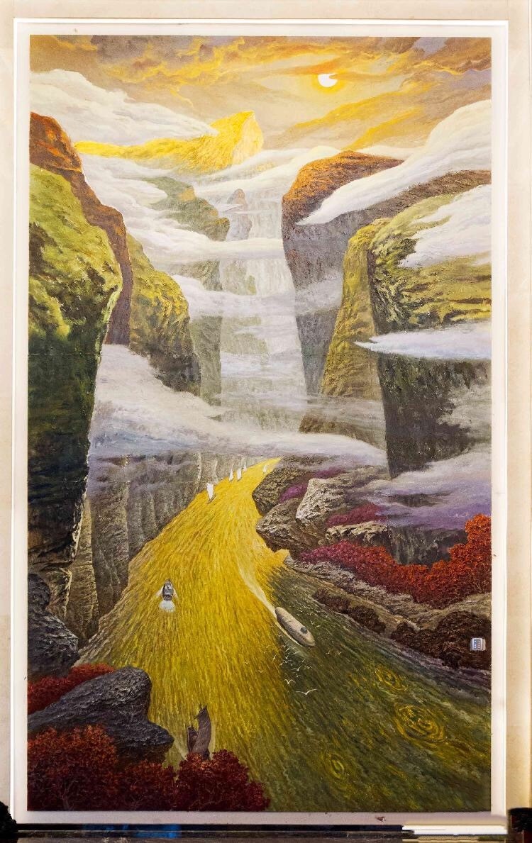 擅长综合技法绘画的许世虎教授在这次创作中汲取了雕塑的灵感,在绘画的准备工作其间,许世虎教授使用了多达三四十公斤乳白胶打底以及十几桶塑形膏进行塑形,更加真实立体地展现画中的山、石、水。在此基础上,再着色晕彩,山、石、水、云等景物的立体感由此显现了出来。