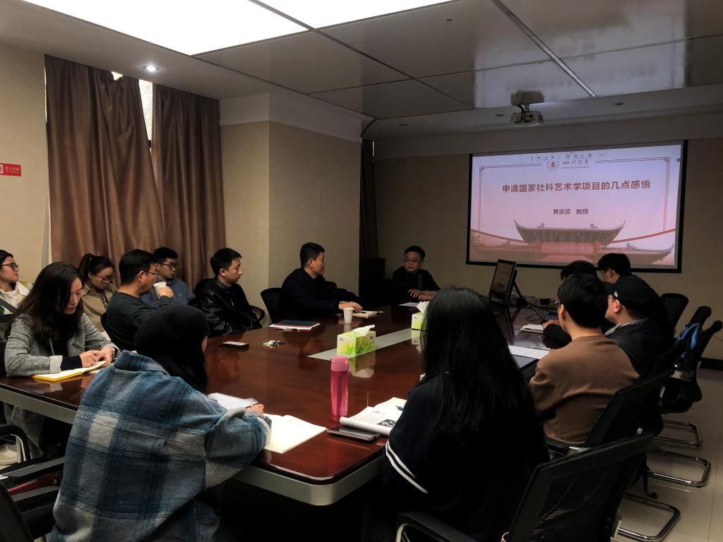 ,在417会议室为课题申报教师分享《申请国家社科艺术学项目的几点感悟》,从“粮草先行——提前贮备课题资源、思问之道——追问选题的价值、洪荒之力——劳心费神撰写论证书、细节决定成败——吹毛求疵提升颜值、坚持就是胜利——屡战屡败屡败屡战”五个方面分享了自己近年来对国家社科基金申报及评审的经验,与大家深入交流互动,并针对老师的申报文本提出具体要求及建议。