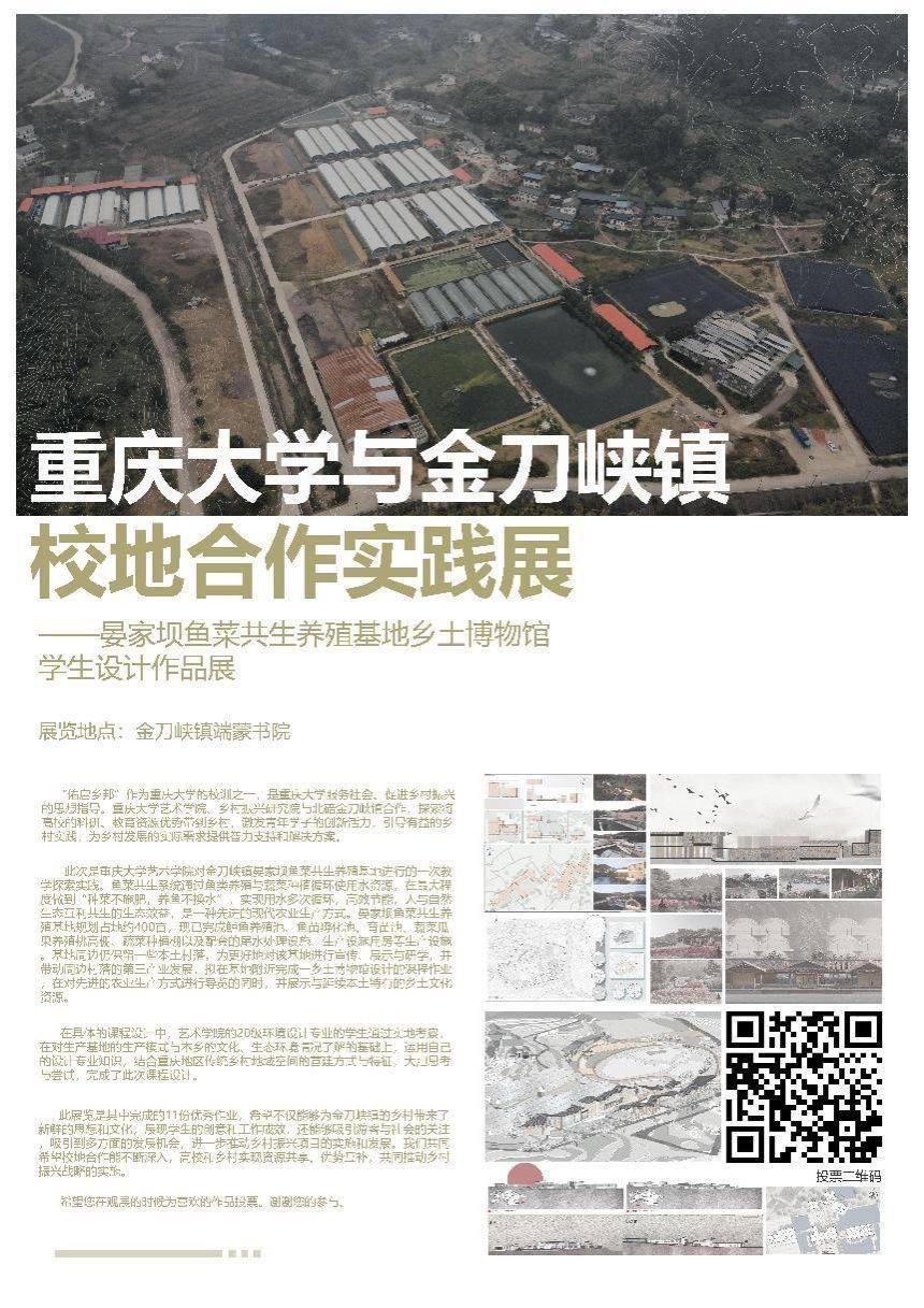 这次课程设计成果展是对金刀峡镇晏家坝鱼菜共生养殖基地进行的一次设计探索。为了更好地对该基地进行设计并带动周边村落的第三产业发展,课程拟定在基地附近完成乡土博物馆设计,对当地的农业生产方式进行导览,并展示与延续本土特有的文化资源。