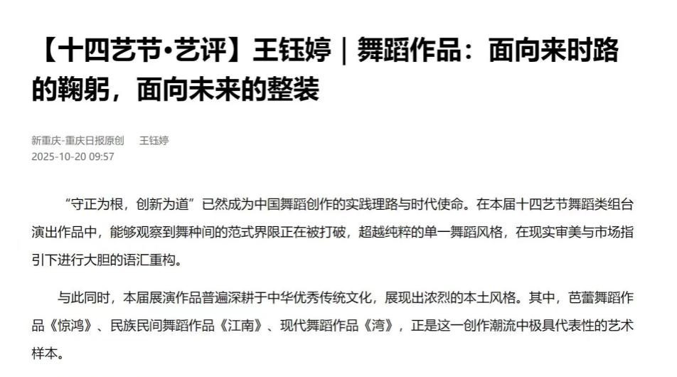 2023、2024、2025级舞蹈研究领域的硕士研究生在指导教师的带领下组成评论团,同学们沉浸于舞剧、歌剧、戏曲等多元艺术形式中,并以舞蹈专业的独特视角,聚焦作品的身体叙事、精神内核及文化内涵,由此展开深度思考与多维解读。活动期间,团队累计撰写评论文章11篇,其中6篇稿件经主办方推荐与媒体单位遴选,成功发表于重庆文艺网、第1眼TV-华龙网等重庆主流新媒体平台,其中有2篇文章登上《重庆日报》网络平台。