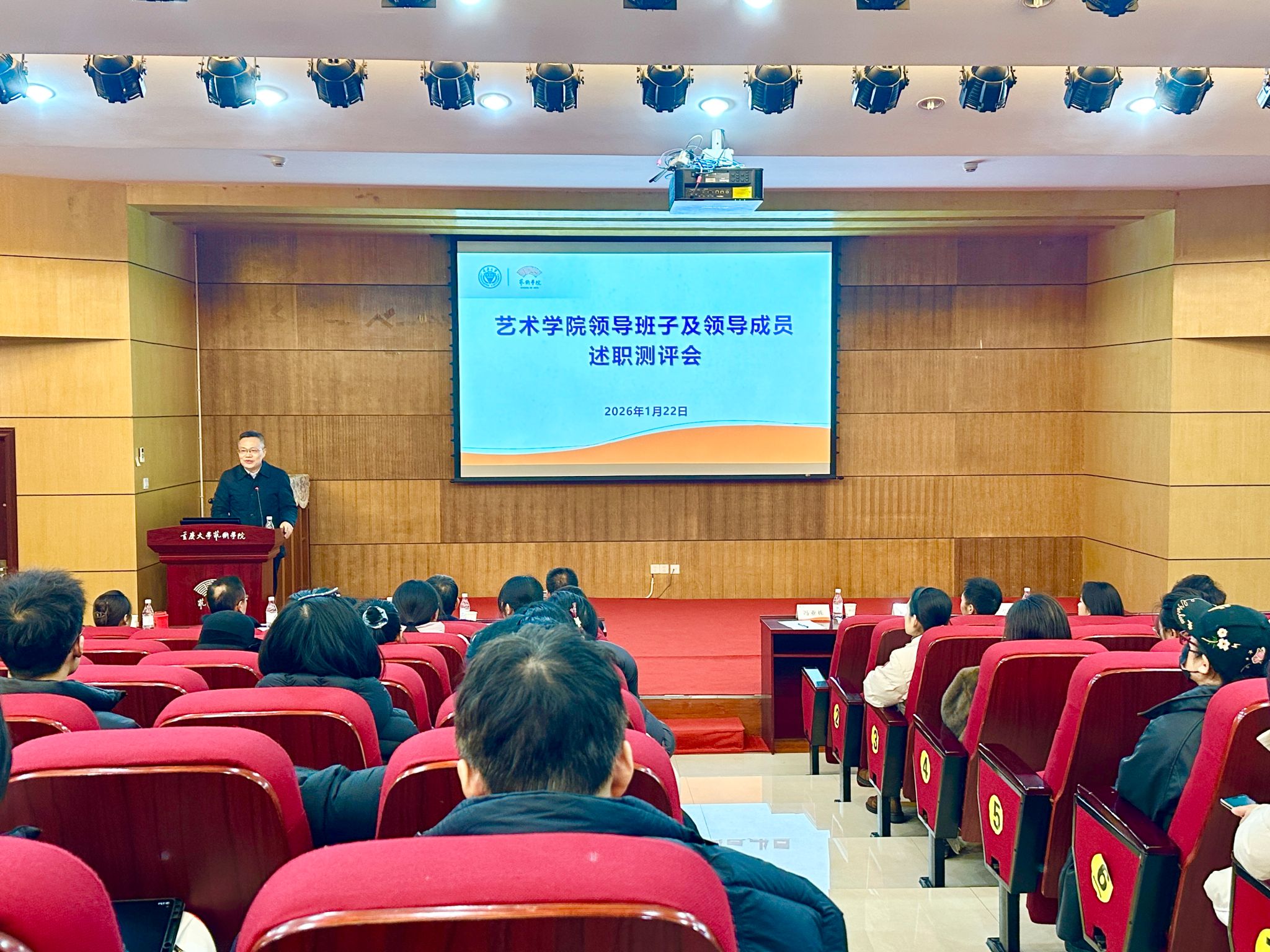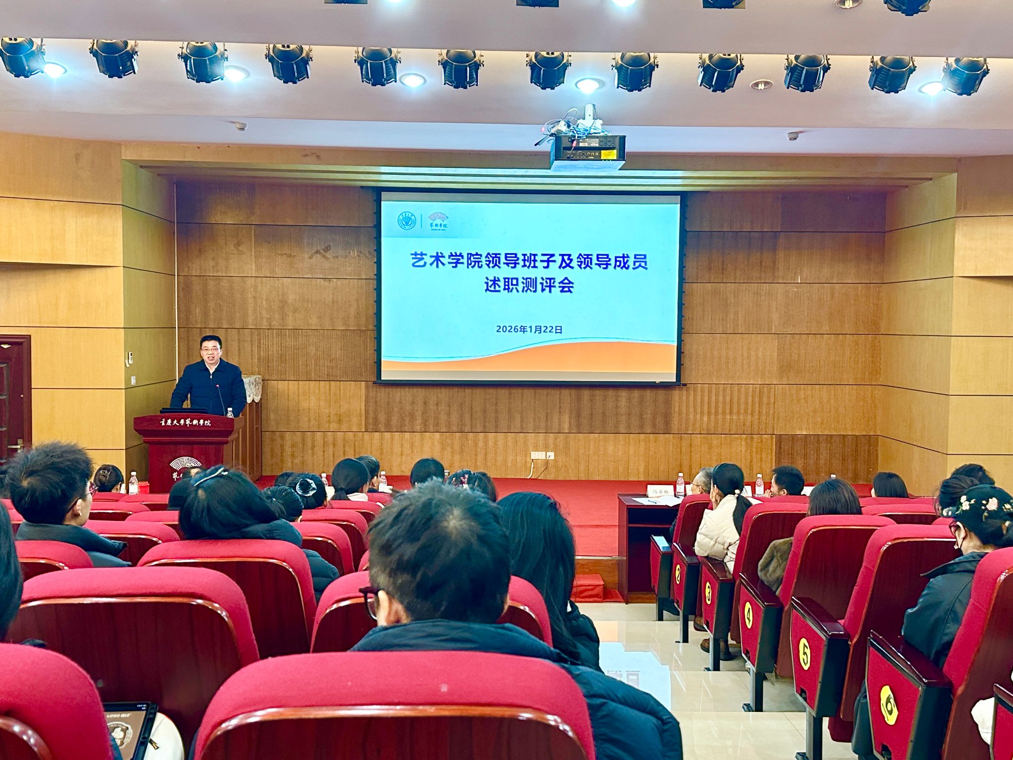 2025年度领导班子及领导成员述职民主测评会在学院办公楼学术报告厅举行。校党委副书记冯业栋出席并讲话,学校党委考核组成员、校党委统战部副部长陈西东及发规处政策研究办公室副主任陈莹到会指导。国产自慰