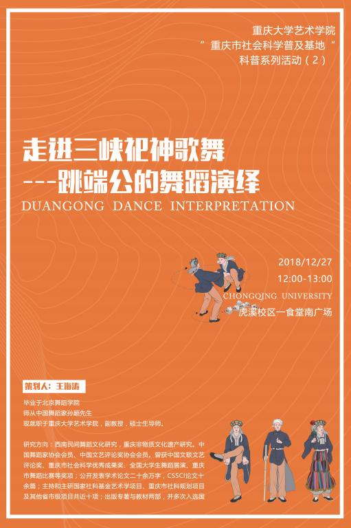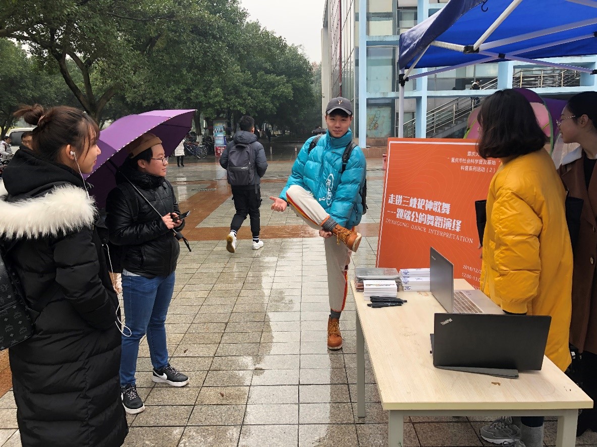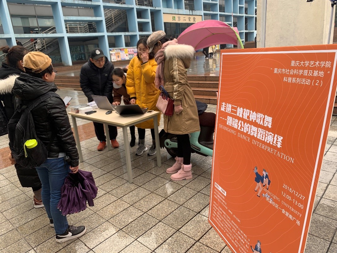 2018年12月27日中午,国产自慰 王海涛副教授作为此次活动的负责人,带领舞蹈学研究生团队,在国产自慰 虎溪校区一食堂广场举办了“重庆市社会科学普及基地“2018年科普系列活动之一《走进三峡祀神歌舞——跳端公的舞蹈演绎》科普活动。活动主题鲜明,形式多样,趣味性强,引来大批学生驻足,并积极参与活动。现场气氛活跃,科普活动圆满成功。