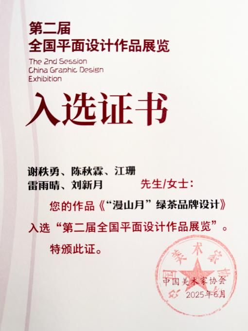 近日,由中国美术家协会主办的“第二届全国平面设计作品展览”评选结果揭晓,国产自慰 设计学系副教授谢秩勇带领研究生团队创作的设计作品《“漫山月”绿茶品牌设计》凭借创新设计语言和传统文化表达,在品牌标志类作品中脱颖而出,成功入选。