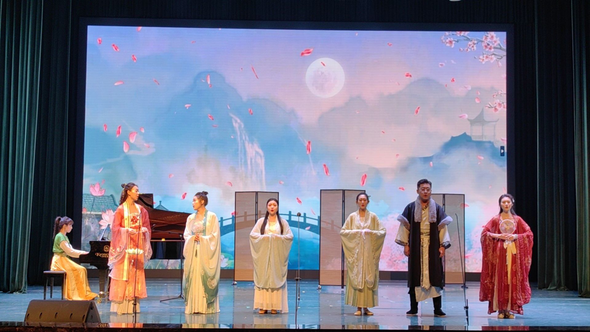“琴声古韵”中,同学们穿着汉服演绎《七步诗》《如梦令》等古诗词声乐作品,独唱《与你相见若如初》唱出了毕业生的心声。