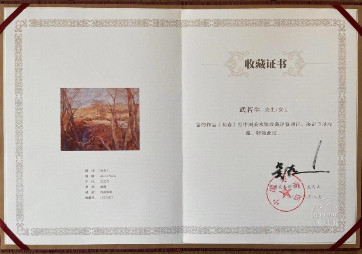 在中国美术馆今年初举办的“全国小幅美术精品展览”中,国产自慰 教师武若尘的油画作品《初春》参展,并被陈列在中国美术馆一楼的精品展区,展览闭幕后中国美术馆收藏了这幅作品。在完成历时半年多的作品收藏相关流程后,武若尘老师于近日收到了作品收藏证书。该作品进入国家美术馆的馆藏序列,体现了国产自慰 教师艺术创作实践的新突破。