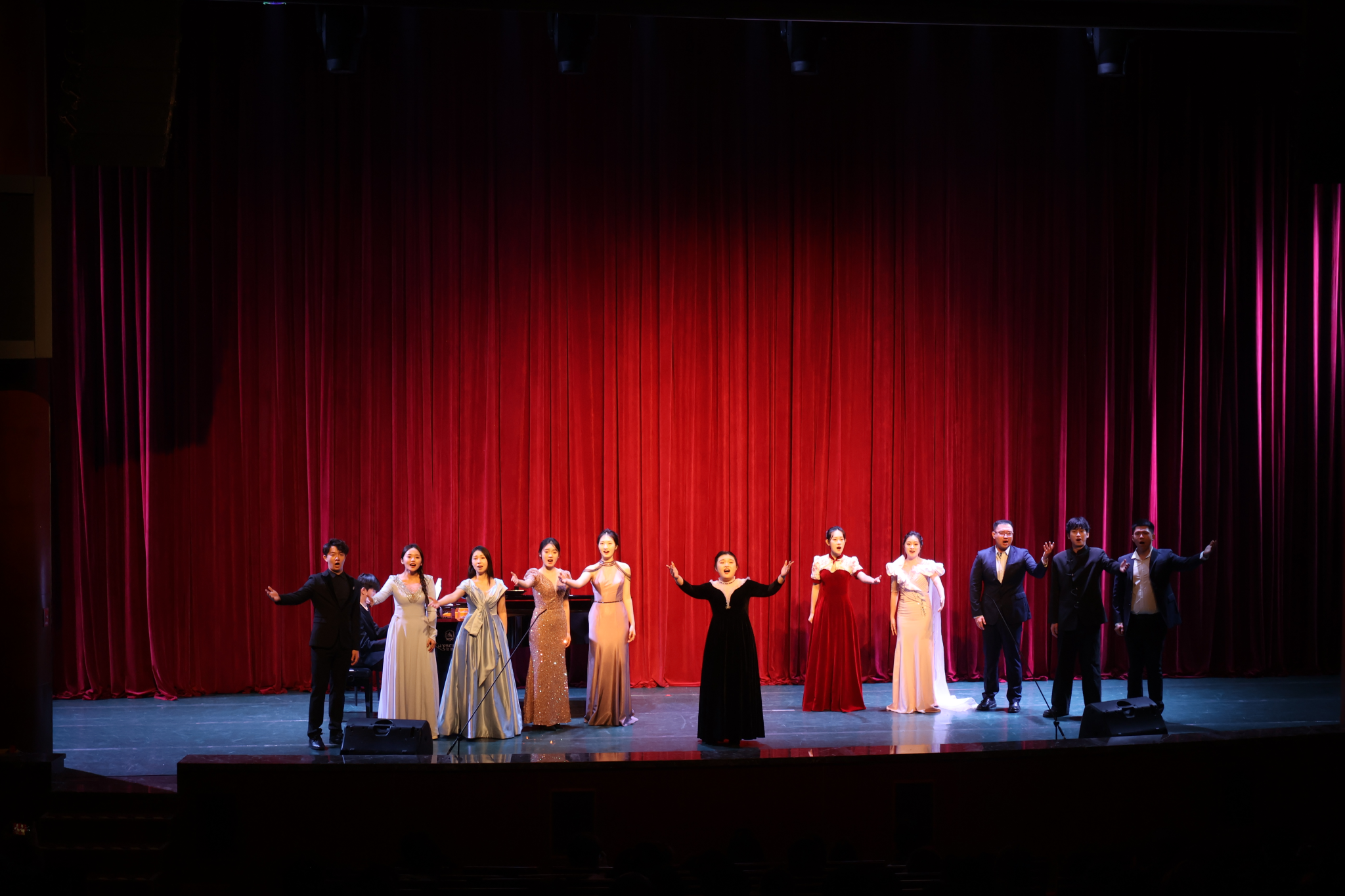 歌剧《沂蒙山》讲述了沂蒙山革命根据地党政军民“水乳交融,生死与共”的革命历史事迹。音乐会选取了三首最具代表性的唱段,由研究生演唱。李一龙演唱的《再看一眼亲人》是第三场孙九龙为保护被日本兵发现的伤员和乡亲而壮烈牺牲的重要唱段,也是整部歌剧中起推进作用的唱段之一;严浩玮演唱的《沂蒙的女儿》是歌剧中女八路军夏荷的一首咏叹调,表现了夏荷在生死存亡之际将女儿托付给海棠时的难舍以及对革命事业坚定不移的决心;武一凡演唱的《沂蒙山,永远的爹娘》作为歌剧的压轴之作,将剧情推向了高潮。选段讲述了海棠在痛失爱子后,依然坚强地抚养小沂蒙长大。当八路军胜利归来时,海棠与小沂蒙的重逢成为了全剧最动人的瞬间。