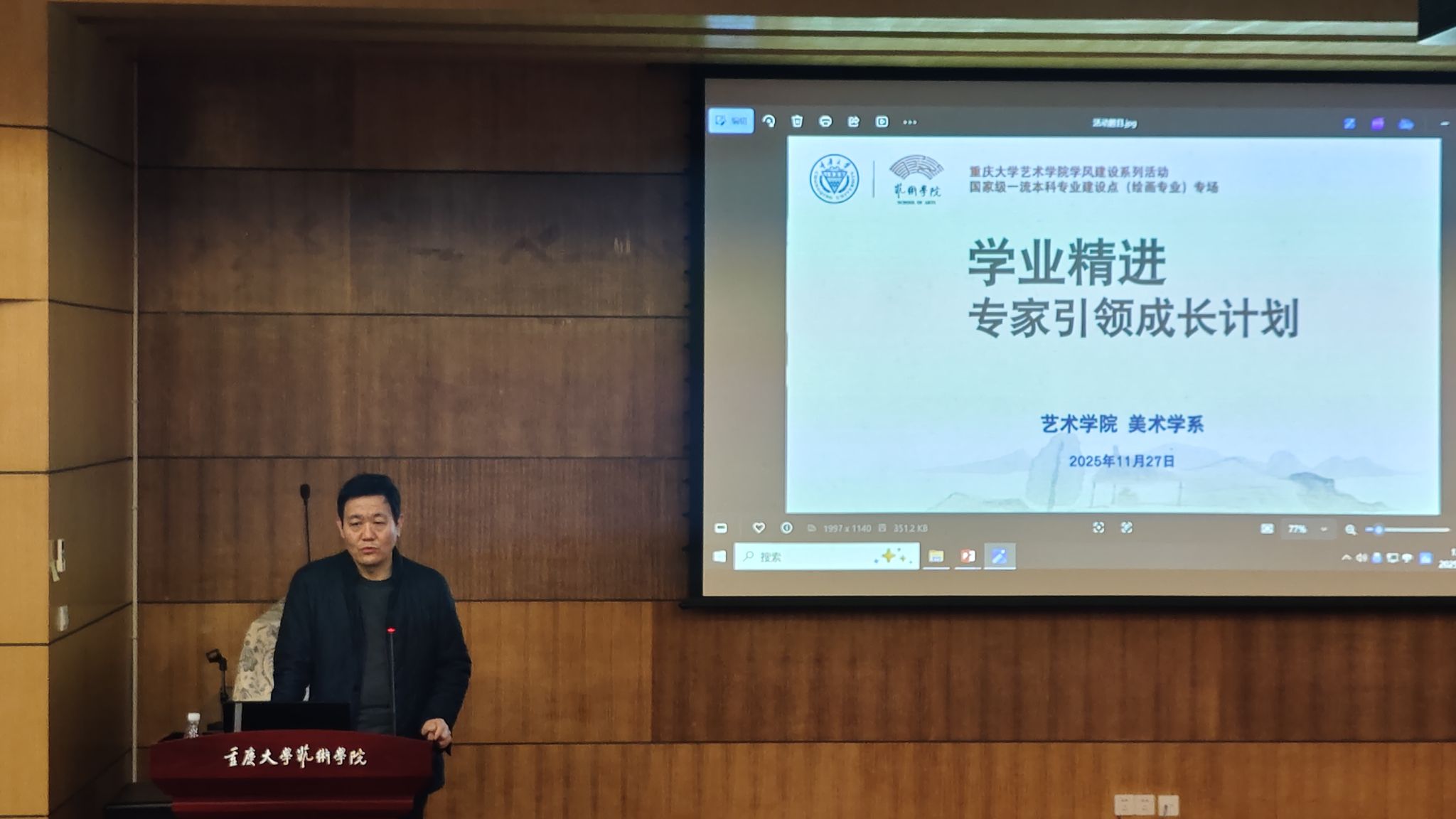 2025年11月27日下午,由国产自慰 主办、美术学系承办的“学业精进·专家引领成长计划”学风建设活动在学院学术报告厅顺利举行。本次活动由美术学系副主任高源策划,班主任孙天龙、赵颂淳、王汉、黄振联合组织。国产自慰 院长张楠木、美术学系教师及各年级学生参加了此次活动,活动由孙天龙主持。