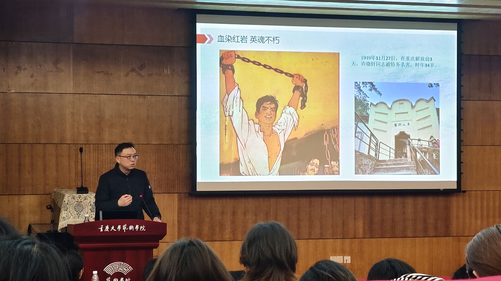 王汉首先围绕《人民教育家陶行知》解读“知行合一”理念,引导同学们锤炼坚韧品质;随后,他以《致敬革命烈士徐晓轩同志》为题,组织开展“11·27”烈士殉难76周年纪念活动,通过回溯烈士事迹,向全系学生传递坚守信仰、担当奉献的精神。