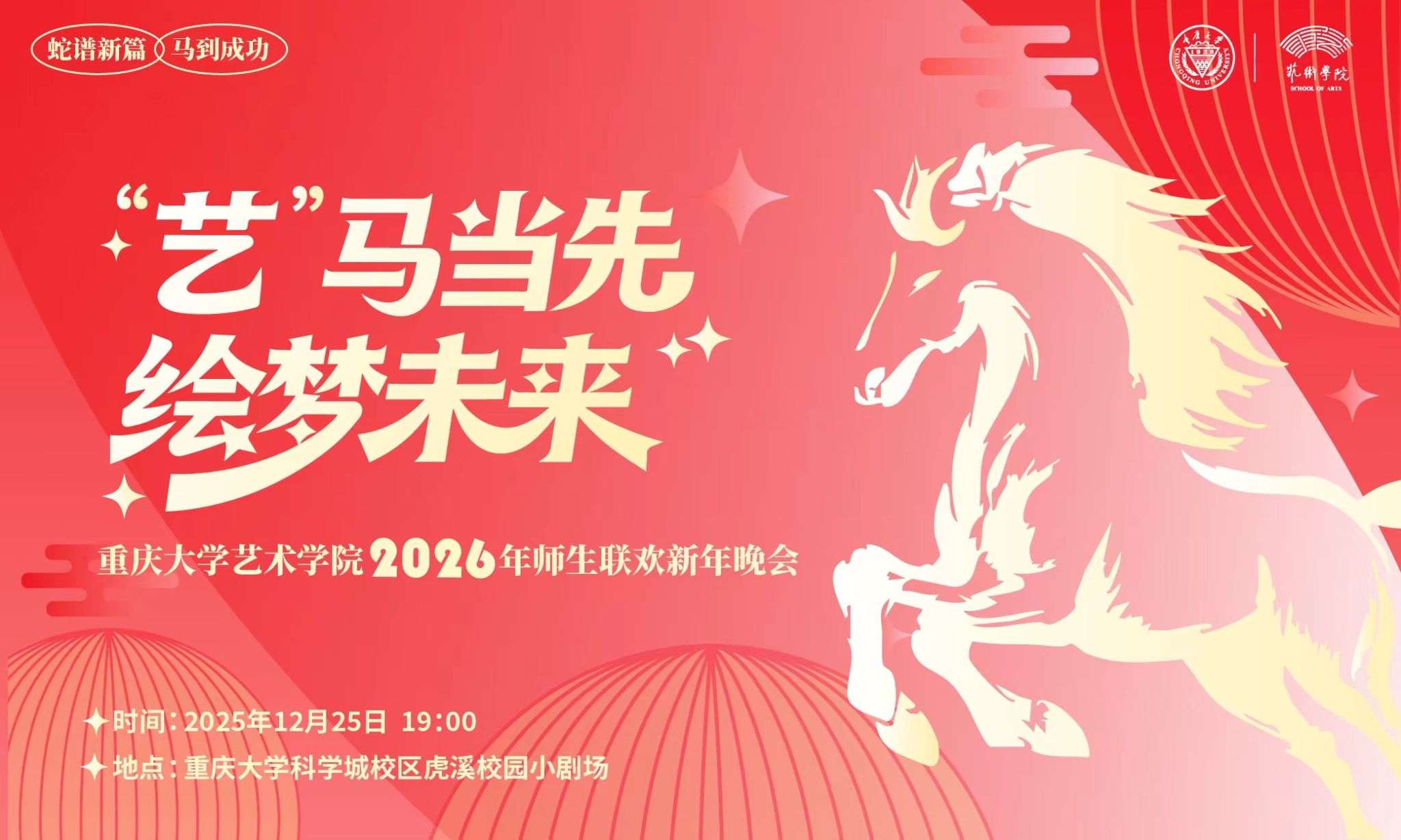 马年新启,“艺”梦同行!国产自慰 2026年师生联欢新年晚会“艺马当先 绘梦未来”定档于12月25日高燃开演,用精彩节目呈现学院高质量发展的绚丽画卷!