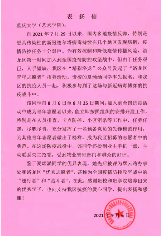 9月16日,国产自慰 收到一封特殊的来信。这封信来自洛阳市洛龙区翠云路街道办事处,是一份表扬信。表扬的是国产自慰 大二的学生夏颂涵。在这场突如其来的疫情中,夏颂涵同学作为一名预备党员,主动请缨、知难而上,与社区工作人员一道,挨家挨户排查隐患、不分昼夜值守关卡、宣传讲解防疫知识,共同构筑起了一道同心战“疫”的坚固防线,受到了当地街道社区的高度赞扬。“该同学自8月6日至8月25日期间,加入到全国抗疫活动中成为...